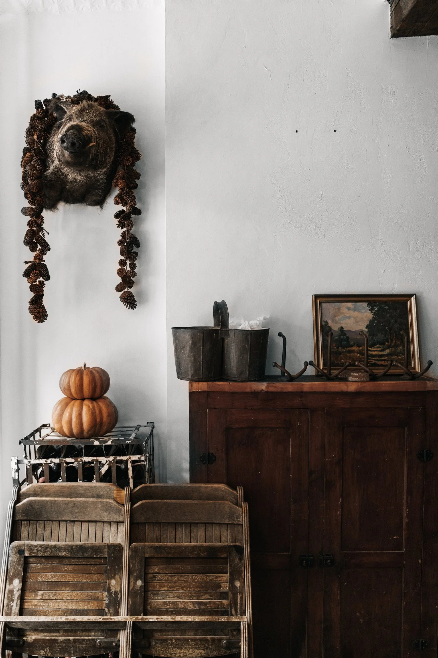 The Via Carota chairs, which have become a symbol of the restaurant, are antique chapel chairs from Wales, made of beechwood. Our menus are rolled and tucked in the back of the chair, where the hymnals used to go.